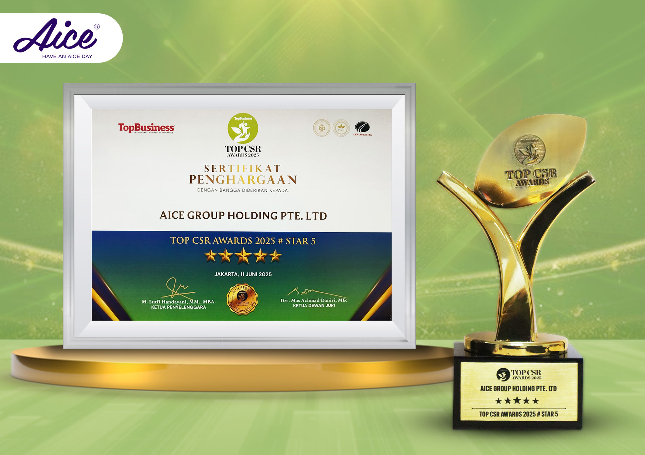 Capaian ini menegaskan posisi Aice sebagai perusahaan industri es krim pertama di Indonesia yang berhasil mempertahankan rekam jejak CSR secara konsisten dan progresif selama lima tahun berturut-turut. Penghargaan TOP CSR level bintang lima menjadi penghargaan khusus bagi perusahaan yang mampu menunjukkan keselarasan tinggi antara strategi CSR dengan pertumbuhan bisnis berkelanjutan, mengadopsi standar ISO 26000 tentang tanggung jawab sosial, pendekatan Lingkungan, Sosial dan Tata Kelola (ESG), hingga implementasi Creating Shared Value (CSV) secara optimal.