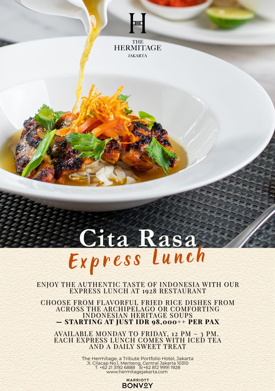 Bagi Anda yang ingin menikmati makan siang cepat namun berkelas, Cita Rasa Express Lunch di The Hermitage Hotel Jakarta adalah pilihan yang tak boleh dilewatkan. (why)