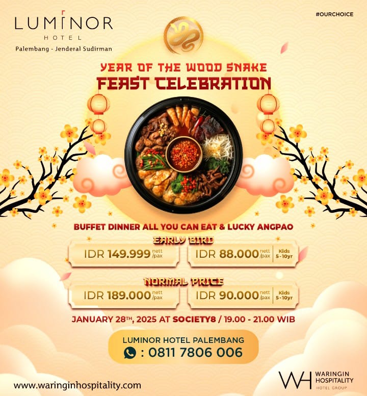 Menyambut Tahun Baru Imlek 2025 yang bertepatan dengan Tahun Ular Kayu, Luminor Hotel Palembang menghadirkan perayaan spesial dengan tajuk “Year of the Wood Snake Feast Celebration” yang akan berlangsung di Society8 Cafe pada tanggal 28 Januari 2025, pukul 19:00 – 21:00 WIB.