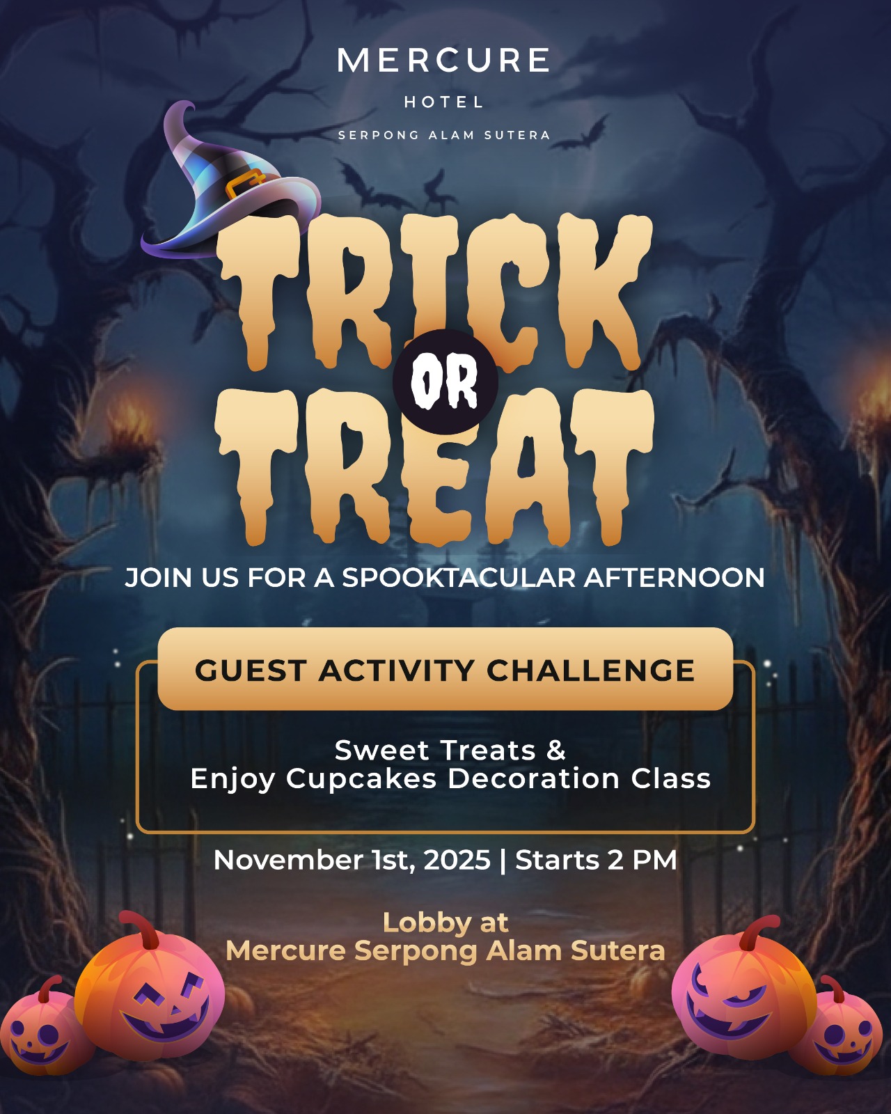 binomedia.id – Tangerang. Menyambut momen Halloween, Mercure Serpong Alam Sutera menggelar acara spesial bertajuk “Trick or Treat” yang siap menghadirkan pengalaman seru dan interaktif bagi seluruh tamu hotel. Acara ini akan digelar pada Sabtu, 1 November 2025, mulai pukul 14.00 hingga 16.00 WIB, berlokasi di lobby hotel yang telah dihias dengan dekorasi khas Halloween.