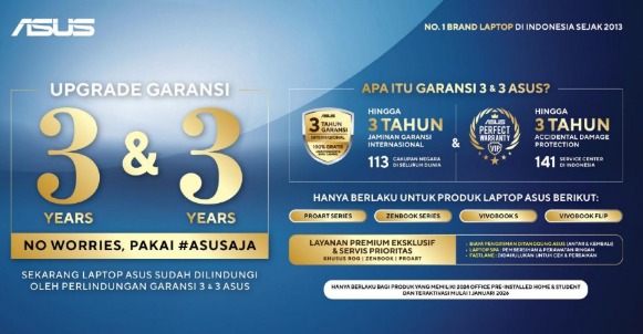 • Zenbook, Vivobook S, Vivobook Flip, dan ProArt: 3 tahun Garansi Internasional dan 3 tahun ADP.