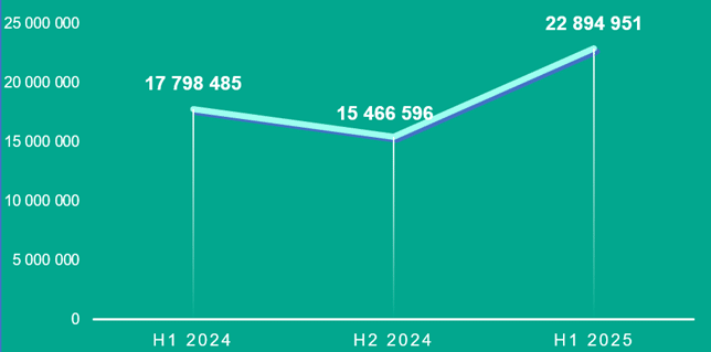 Jumlah serangan terhadap pengguna ponsel, secara global, H1 2024 – H1 2025